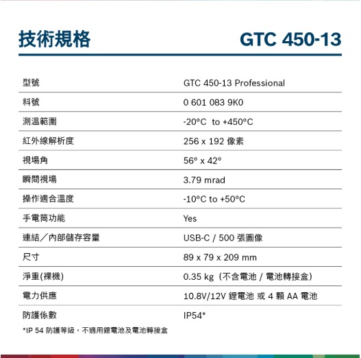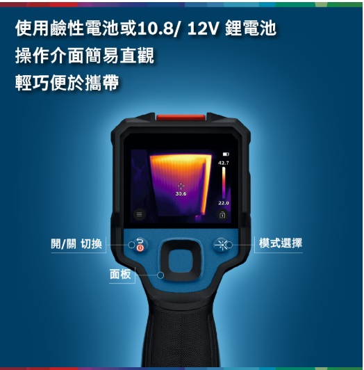 GTC 12V-450-13 Professional提供靈活的雙電源設計,方便您交替使用BOSCH12V鋰離子電池和AA鹼性電池,盡可能縮短停機時間。USB介面讓您輕鬆擷取和傳輸多達500張影像,確保工作效率。這款熱像儀還可搭配相容的AA電池轉接器等配件使用,讓您隨時準備處理任何工作。