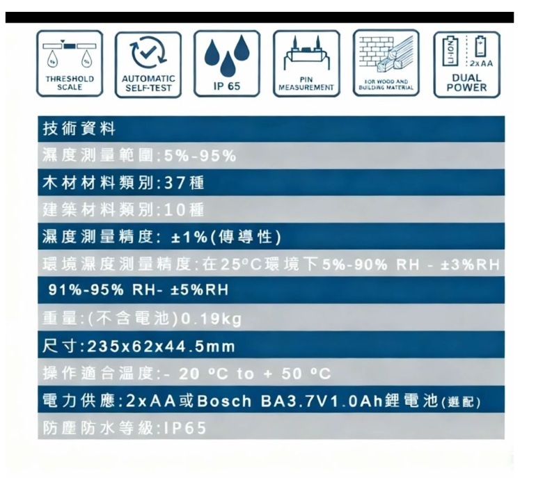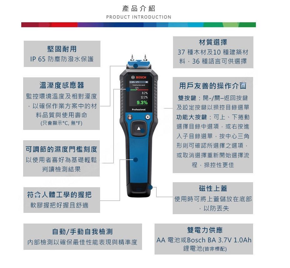 ⦁ 可測量37種木材和10種建築材料的水分含量。