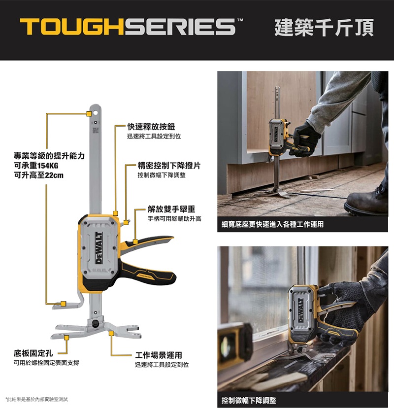 • 可承重154KG,可升高至22cm• 快速釋放按鈕• 精密控制下降撥片,控制微幅下降調整• 底板固定孔,可用於螺栓固定表面支撐